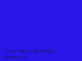 Yxy 6.738,0.158,0.069 Color is a normal indigo color and the nearest color is Bluebonnet #1c1cf0. Hex code #2716e6 and RGB value is rgb(39,22,230). In RGB color space, this color is composed of 15% red, 9% green, 90% blue, In CMYK color space, this color is composed of 83% cyan, 90% magenta, 0% yellow , 10% black , In HSL color space, this color has a hue angle of 245° , 83% saturation and 49% lightness.