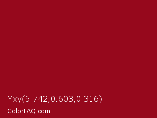 Yxy 6.742,0.603,0.316 Color is a normal red color and the nearest color is Carmine #960018. Hex code #96081c and RGB value is rgb(150,8,28). In RGB color space, this color is composed of 59% red, 3% green, 11% blue, In CMYK color space, this color is composed of 0% cyan, 95% magenta, 81% yellow , 41% black , In HSL color space, this color has a hue angle of 352° , 90% saturation and 31% lightness.