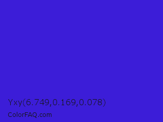 Yxy 6.749,0.169,0.078 Color is a normal indigo color and the nearest color is Interdimensional Blue #360ccc. Hex code #3c1dd8 and RGB value is rgb(60,29,216). In RGB color space, this color is composed of 24% red, 11% green, 85% blue, In CMYK color space, this color is composed of 72% cyan, 87% magenta, 0% yellow , 15% black , In HSL color space, this color has a hue angle of 250° , 76% saturation and 48% lightness.