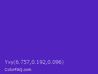 Yxy 6.757,0.192,0.096 Color is a normal indigo color and the nearest color is Purple Heart Crayola #652dc1. Hex code #5223bf and RGB value is rgb(82,35,191). In RGB color space, this color is composed of 32% red, 14% green, 75% blue, In CMYK color space, this color is composed of 57% cyan, 82% magenta, 0% yellow , 25% black , In HSL color space, this color has a hue angle of 258° , 69% saturation and 44% lightness.