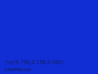 Yxy 6.759,0.158,0.082 Color is a normal blue color and the nearest color is Palatinate Blue #273be2. Hex code #112dd4 and RGB value is rgb(17,45,212). In RGB color space, this color is composed of 7% red, 18% green, 83% blue, In CMYK color space, this color is composed of 92% cyan, 79% magenta, 0% yellow , 17% black , In HSL color space, this color has a hue angle of 231° , 85% saturation and 45% lightness.
