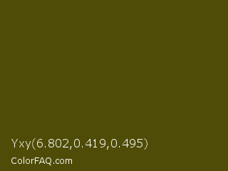 Yxy 6.802,0.419,0.495 Color is a very dark yellow color and the nearest color is Verdun Green #495400. Hex code #4e4c06 and RGB value is rgb(78,76,6). In RGB color space, this color is composed of 31% red, 30% green, 2% blue, In CMYK color space, this color is composed of 0% cyan, 3% magenta, 92% yellow , 69% black , In HSL color space, this color has a hue angle of 58° , 86% saturation and 16% lightness.