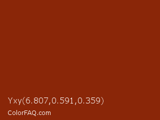 Yxy 6.807,0.591,0.359 Color is a dark red color and the nearest color is Smokey Topaz #832a0d. Hex code #8a2608 and RGB value is rgb(138,38,8). In RGB color space, this color is composed of 54% red, 15% green, 3% blue, In CMYK color space, this color is composed of 0% cyan, 72% magenta, 94% yellow , 46% black , In HSL color space, this color has a hue angle of 14° , 89% saturation and 29% lightness.