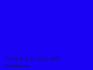 Yxy 6.812,0.153,0.062 Color is a normal indigo color and the nearest color is Bluebonnet #1c1cf0. Hex code #1a02f4 and RGB value is rgb(26,2,244). In RGB color space, this color is composed of 10% red, 1% green, 96% blue, In CMYK color space, this color is composed of 89% cyan, 99% magenta, 0% yellow , 4% black , In HSL color space, this color has a hue angle of 246° , 98% saturation and 48% lightness.