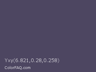 Yxy 6.821,0.28,0.258 Color is a normal indigo color and the nearest color is Mulled Wine #4e4562. Hex code #4d4661 and RGB value is rgb(77,70,97). In RGB color space, this color is composed of 30% red, 27% green, 38% blue, In CMYK color space, this color is composed of 21% cyan, 28% magenta, 0% yellow , 62% black , In HSL color space, this color has a hue angle of 256° , 16% saturation and 33% lightness.