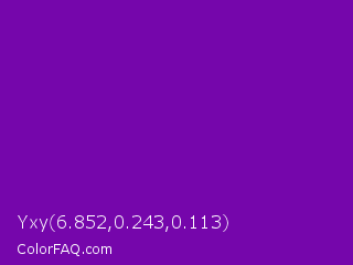 Yxy 6.852,0.243,0.113 Color is a normal purple color and the nearest color is Violet RYB #8601af. Hex code #7506ab and RGB value is rgb(117,6,171). In RGB color space, this color is composed of 46% red, 2% green, 67% blue, In CMYK color space, this color is composed of 32% cyan, 96% magenta, 0% yellow , 33% black , In HSL color space, this color has a hue angle of 280° , 93% saturation and 35% lightness.