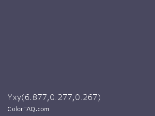 Yxy 6.877,0.277,0.267 Color is a normal indigo color and the nearest color is Mulled Wine #4e4562. Hex code #49485f and RGB value is rgb(73,72,95). In RGB color space, this color is composed of 29% red, 28% green, 37% blue, In CMYK color space, this color is composed of 23% cyan, 24% magenta, 0% yellow , 63% black , In HSL color space, this color has a hue angle of 243° , 14% saturation and 33% lightness.