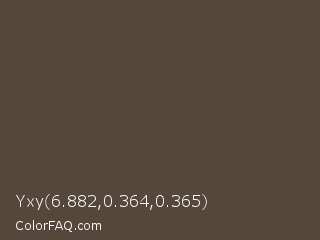 Yxy 6.882,0.364,0.365 Color is a dark orange color and the nearest color is Kabul #5e483e. Hex code #55483b and RGB value is rgb(85,72,59). In RGB color space, this color is composed of 33% red, 28% green, 23% blue, In CMYK color space, this color is composed of 0% cyan, 15% magenta, 31% yellow , 67% black , In HSL color space, this color has a hue angle of 30° , 18% saturation and 28% lightness.