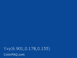 Yxy 6.901,0.178,0.155 Color is a normal blue color and the nearest color is Yale Blue #0f4d92. Hex code #094896 and RGB value is rgb(9,72,150). In RGB color space, this color is composed of 4% red, 28% green, 59% blue, In CMYK color space, this color is composed of 94% cyan, 52% magenta, 0% yellow , 41% black , In HSL color space, this color has a hue angle of 213° , 89% saturation and 31% lightness.