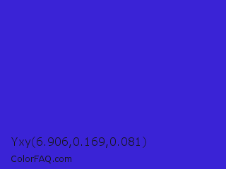 Yxy 6.906,0.169,0.081 Color is a normal indigo color and the nearest color is Interdimensional Blue #360ccc. Hex code #3a23d6 and RGB value is rgb(58,35,214). In RGB color space, this color is composed of 23% red, 14% green, 84% blue, In CMYK color space, this color is composed of 73% cyan, 84% magenta, 0% yellow , 16% black , In HSL color space, this color has a hue angle of 248° , 72% saturation and 49% lightness.