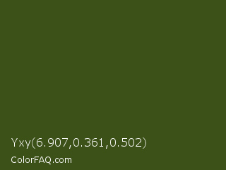 Yxy 6.907,0.361,0.502 Color is a very dark green color and the nearest color is Clover #384910. Hex code #3c5117 and RGB value is rgb(60,81,23). In RGB color space, this color is composed of 24% red, 32% green, 9% blue, In CMYK color space, this color is composed of 26% cyan, 0% magenta, 72% yellow , 68% black , In HSL color space, this color has a hue angle of 82° , 56% saturation and 20% lightness.