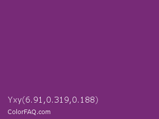 Yxy 6.91,0.319,0.188 Color is a normal magenta color and the nearest color is Midnight #702670. Hex code #772a77 and RGB value is rgb(119,42,119). In RGB color space, this color is composed of 47% red, 16% green, 47% blue, In CMYK color space, this color is composed of 0% cyan, 65% magenta, 0% yellow , 53% black , In HSL color space, this color has a hue angle of 300° , 48% saturation and 32% lightness.