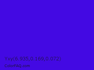 Yxy 6.935,0.169,0.072 Color is a normal indigo color and the nearest color is Interdimensional Blue #360ccc. Hex code #4309e3 and RGB value is rgb(67,9,227). In RGB color space, this color is composed of 26% red, 4% green, 89% blue, In CMYK color space, this color is composed of 70% cyan, 96% magenta, 0% yellow , 11% black , In HSL color space, this color has a hue angle of 256° , 92% saturation and 46% lightness.