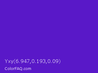 Yxy 6.947,0.193,0.09 Color is a normal violet color and the nearest color is Purple Heart Crayola #652dc1. Hex code #5918c8 and RGB value is rgb(89,24,200). In RGB color space, this color is composed of 35% red, 9% green, 78% blue, In CMYK color space, this color is composed of 56% cyan, 88% magenta, 0% yellow , 22% black , In HSL color space, this color has a hue angle of 262° , 79% saturation and 44% lightness.