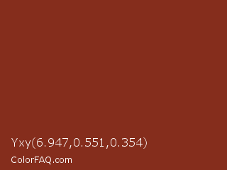 Yxy 6.947,0.551,0.354 Color is a normal red color and the nearest color is Kobe #882d17. Hex code #852d1c and RGB value is rgb(133,45,28). In RGB color space, this color is composed of 52% red, 18% green, 11% blue, In CMYK color space, this color is composed of 0% cyan, 66% magenta, 79% yellow , 48% black , In HSL color space, this color has a hue angle of 10° , 65% saturation and 32% lightness.