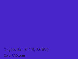 Yxy 6.951,0.18,0.089 Color is a normal indigo color and the nearest color is Interdimensional Blue #360ccc. Hex code #4824cb and RGB value is rgb(72,36,203). In RGB color space, this color is composed of 28% red, 14% green, 80% blue, In CMYK color space, this color is composed of 65% cyan, 82% magenta, 0% yellow , 20% black , In HSL color space, this color has a hue angle of 253° , 70% saturation and 47% lightness.