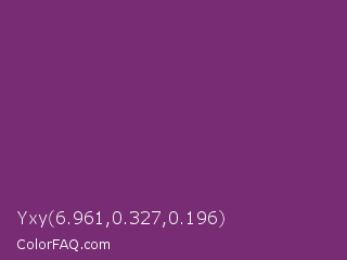 Yxy 6.961,0.327,0.196 Color is a normal magenta color and the nearest color is Midnight #702670. Hex code #772c73 and RGB value is rgb(119,44,115). In RGB color space, this color is composed of 47% red, 17% green, 45% blue, In CMYK color space, this color is composed of 0% cyan, 63% magenta, 3% yellow , 53% black , In HSL color space, this color has a hue angle of 303° , 46% saturation and 32% lightness.