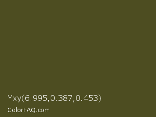 Yxy 6.995,0.387,0.453 Color is a very dark yellow color and the nearest color is Army Green #4b5320. Hex code #4d4d21 and RGB value is rgb(77,77,33). In RGB color space, this color is composed of 30% red, 30% green, 13% blue, In CMYK color space, this color is composed of 0% cyan, 0% magenta, 57% yellow , 70% black , In HSL color space, this color has a hue angle of 60° , 40% saturation and 22% lightness.