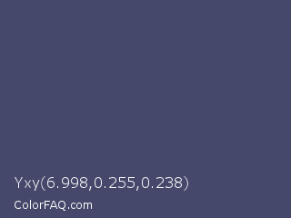 Yxy 6.998,0.255,0.238 Color is a normal blue color and the nearest color is Independence #4c516d. Hex code #46486b and RGB value is rgb(70,72,107). In RGB color space, this color is composed of 27% red, 28% green, 42% blue, In CMYK color space, this color is composed of 35% cyan, 33% magenta, 0% yellow , 58% black , In HSL color space, this color has a hue angle of 237° , 21% saturation and 35% lightness.