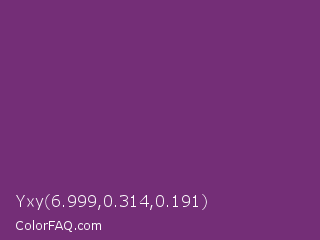 Yxy 6.999,0.314,0.191 Color is a normal magenta color and the nearest color is Maximum Purple #733380. Hex code #742e77 and RGB value is rgb(116,46,119). In RGB color space, this color is composed of 45% red, 18% green, 47% blue, In CMYK color space, this color is composed of 3% cyan, 61% magenta, 0% yellow , 53% black , In HSL color space, this color has a hue angle of 298° , 44% saturation and 32% lightness.