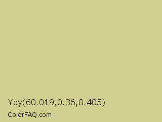 Yxy 60.019,0.36,0.405 Color is a light yellow color and the nearest color is Winter Hazel #d5d195. Hex code #d0cf8f and RGB value is rgb(208,207,143). In RGB color space, this color is composed of 82% red, 81% green, 56% blue, In CMYK color space, this color is composed of 0% cyan, 0% magenta, 31% yellow , 18% black , In HSL color space, this color has a hue angle of 59° , 41% saturation and 69% lightness.