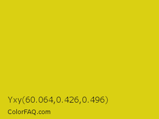 Yxy 60.064,0.426,0.496 Color is a normal yellow color and the nearest color is Bird Flower #d4cd16. Hex code #dad012 and RGB value is rgb(218,208,18). In RGB color space, this color is composed of 85% red, 82% green, 7% blue, In CMYK color space, this color is composed of 0% cyan, 5% magenta, 92% yellow , 15% black , In HSL color space, this color has a hue angle of 57° , 85% saturation and 46% lightness.