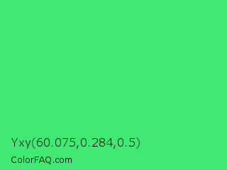Yxy 60.075,0.284,0.5 Color is a normal green color and the nearest color is UFO Green #3cd070. Hex code #41e873 and RGB value is rgb(65,232,115). In RGB color space, this color is composed of 25% red, 91% green, 45% blue, In CMYK color space, this color is composed of 72% cyan, 0% magenta, 50% yellow , 9% black , In HSL color space, this color has a hue angle of 138° , 78% saturation and 58% lightness.