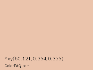Yxy 60.121,0.364,0.356 Color is a light orange color and the nearest color is Zinnwaldite #ebc2af. Hex code #ebc4ac and RGB value is rgb(235,196,172). In RGB color space, this color is composed of 92% red, 77% green, 67% blue, In CMYK color space, this color is composed of 0% cyan, 17% magenta, 27% yellow , 8% black , In HSL color space, this color has a hue angle of 23° , 61% saturation and 80% lightness.