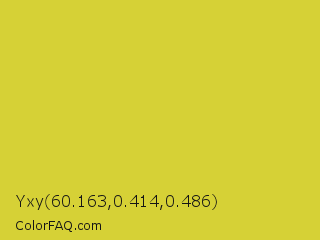 Yxy 60.163,0.414,0.486 Color is a normal yellow color and the nearest color is Pear #d1e231. Hex code #d6d136 and RGB value is rgb(214,209,54). In RGB color space, this color is composed of 84% red, 82% green, 21% blue, In CMYK color space, this color is composed of 0% cyan, 2% magenta, 75% yellow , 16% black , In HSL color space, this color has a hue angle of 58° , 66% saturation and 53% lightness.