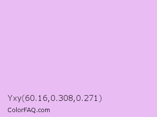 Yxy 60.16,0.308,0.271 Color is a very light purple color and the nearest color is French Lilac #ecc7ee. Hex code #eabcf4 and RGB value is rgb(234,188,244). In RGB color space, this color is composed of 92% red, 74% green, 96% blue, In CMYK color space, this color is composed of 4% cyan, 23% magenta, 0% yellow , 4% black , In HSL color space, this color has a hue angle of 289° , 72% saturation and 85% lightness.
