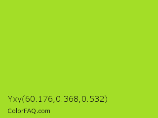 Yxy 60.176,0.368,0.532 Color is a normal lime color and the nearest color is Atlantis #97cd2d. Hex code #a3de27 and RGB value is rgb(163,222,39). In RGB color space, this color is composed of 64% red, 87% green, 15% blue, In CMYK color space, this color is composed of 27% cyan, 0% magenta, 82% yellow , 13% black , In HSL color space, this color has a hue angle of 79° , 73% saturation and 51% lightness.