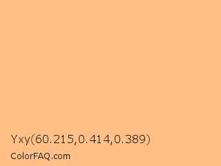 Yxy 60.215,0.414,0.389 Color is a light orange color and the nearest color is Macaroni And Cheese #ffbd88. Hex code #ffbf85 and RGB value is rgb(255,191,133). In RGB color space, this color is composed of 100% red, 75% green, 52% blue, In CMYK color space, this color is composed of 0% cyan, 25% magenta, 48% yellow , 0% black , In HSL color space, this color has a hue angle of 29° , 100% saturation and 76% lightness.