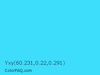 Yxy 60.231,0.22,0.291 Color is a light cyan color and the nearest color is Loeen #15f2fd. Hex code #3cdefc and RGB value is rgb(60,222,252). In RGB color space, this color is composed of 24% red, 87% green, 99% blue, In CMYK color space, this color is composed of 76% cyan, 12% magenta, 0% yellow , 1% black , In HSL color space, this color has a hue angle of 189° , 97% saturation and 61% lightness.