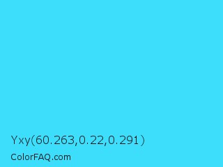 Yxy 60.263,0.22,0.291 Color is a light cyan color and the nearest color is Loeen #15f2fd. Hex code #3cdefc and RGB value is rgb(60,222,252). In RGB color space, this color is composed of 24% red, 87% green, 99% blue, In CMYK color space, this color is composed of 76% cyan, 12% magenta, 0% yellow , 1% black , In HSL color space, this color has a hue angle of 189° , 97% saturation and 61% lightness.