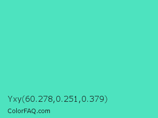 Yxy 60.278,0.251,0.379 Color is a normal cyan color and the nearest color is Turquoise #40e0d0. Hex code #4de3bf and RGB value is rgb(77,227,191). In RGB color space, this color is composed of 30% red, 89% green, 75% blue, In CMYK color space, this color is composed of 66% cyan, 0% magenta, 16% yellow , 11% black , In HSL color space, this color has a hue angle of 166° , 73% saturation and 60% lightness.