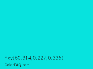 Yxy 60.314,0.227,0.336 Color is a normal cyan color and the nearest color is Bright Turquoise #08e8de. Hex code #07e3de and RGB value is rgb(7,227,222). In RGB color space, this color is composed of 3% red, 89% green, 87% blue, In CMYK color space, this color is composed of 97% cyan, 0% magenta, 2% yellow , 11% black , In HSL color space, this color has a hue angle of 179° , 94% saturation and 46% lightness.