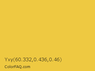 Yxy 60.332,0.436,0.46 Color is a normal yellow color and the nearest color is Sandstorm #ecd540. Hex code #eec941 and RGB value is rgb(238,201,65). In RGB color space, this color is composed of 93% red, 79% green, 25% blue, In CMYK color space, this color is composed of 0% cyan, 16% magenta, 73% yellow , 7% black , In HSL color space, this color has a hue angle of 47° , 84% saturation and 59% lightness.