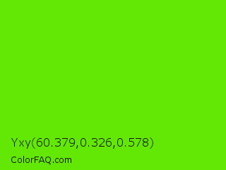 Yxy 60.379,0.326,0.578 Color is a normal green color and the nearest color is Bright Green #66ff00. Hex code #63e806 and RGB value is rgb(99,232,6). In RGB color space, this color is composed of 39% red, 91% green, 2% blue, In CMYK color space, this color is composed of 57% cyan, 0% magenta, 97% yellow , 9% black , In HSL color space, this color has a hue angle of 95° , 95% saturation and 47% lightness.