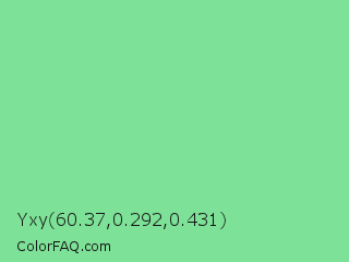 Yxy 60.37,0.292,0.431 Color is a light green color and the nearest color is Light Green #90ee90. Hex code #7de197 and RGB value is rgb(125,225,151). In RGB color space, this color is composed of 49% red, 88% green, 59% blue, In CMYK color space, this color is composed of 44% cyan, 0% magenta, 33% yellow , 12% black , In HSL color space, this color has a hue angle of 136° , 63% saturation and 69% lightness.