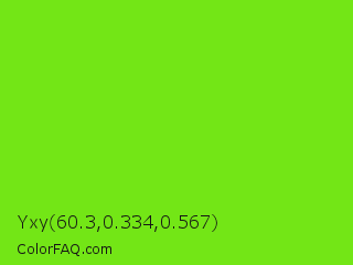 Yxy 60.3,0.334,0.567 Color is a normal green color and the nearest color is Alien Armpit #84de02. Hex code #73e616 and RGB value is rgb(115,230,22). In RGB color space, this color is composed of 45% red, 90% green, 9% blue, In CMYK color space, this color is composed of 50% cyan, 0% magenta, 90% yellow , 10% black , In HSL color space, this color has a hue angle of 93° , 83% saturation and 49% lightness.