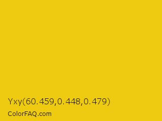 Yxy 60.459,0.448,0.479 Color is a normal yellow color and the nearest color is Jonquil #f4ca16. Hex code #eeca11 and RGB value is rgb(238,202,17). In RGB color space, this color is composed of 93% red, 79% green, 7% blue, In CMYK color space, this color is composed of 0% cyan, 15% magenta, 93% yellow , 7% black , In HSL color space, this color has a hue angle of 50° , 87% saturation and 50% lightness.