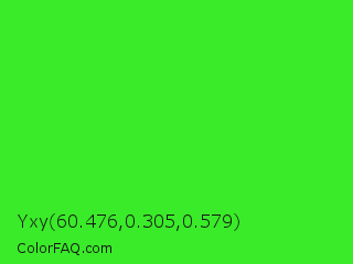 Yxy 60.476,0.305,0.579 Color is a normal green color and the nearest color is Neon Green #39ff14. Hex code #3aeb29 and RGB value is rgb(58,235,41). In RGB color space, this color is composed of 23% red, 92% green, 16% blue, In CMYK color space, this color is composed of 75% cyan, 0% magenta, 83% yellow , 8% black , In HSL color space, this color has a hue angle of 115° , 83% saturation and 54% lightness.