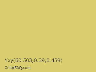 Yxy 60.503,0.39,0.439 Color is a light yellow color and the nearest color is Chenin #dfcd6f. Hex code #d9cf6e and RGB value is rgb(217,207,110). In RGB color space, this color is composed of 85% red, 81% green, 43% blue, In CMYK color space, this color is composed of 0% cyan, 5% magenta, 49% yellow , 15% black , In HSL color space, this color has a hue angle of 54° , 58% saturation and 64% lightness.
