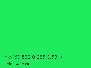 Yxy 60.532,0.285,0.534 Color is a normal green color and the nearest color is Malachite #0bda51. Hex code #20eb5e and RGB value is rgb(32,235,94). In RGB color space, this color is composed of 13% red, 92% green, 37% blue, In CMYK color space, this color is composed of 86% cyan, 0% magenta, 60% yellow , 8% black , In HSL color space, this color has a hue angle of 138° , 84% saturation and 52% lightness.