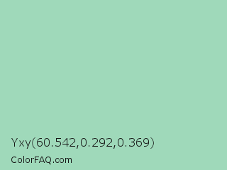 Yxy 60.542,0.292,0.369 Color is a light green color and the nearest color is Turquoise Green #a0d6b4. Hex code #9fd9ba and RGB value is rgb(159,217,186). In RGB color space, this color is composed of 62% red, 85% green, 73% blue, In CMYK color space, this color is composed of 27% cyan, 0% magenta, 14% yellow , 15% black , In HSL color space, this color has a hue angle of 148° , 43% saturation and 74% lightness.
