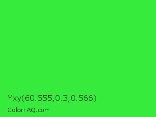 Yxy 60.555,0.3,0.566 Color is a normal green color and the nearest color is Lime Green #32cd32. Hex code #37eb3c and RGB value is rgb(55,235,60). In RGB color space, this color is composed of 22% red, 92% green, 24% blue, In CMYK color space, this color is composed of 77% cyan, 0% magenta, 74% yellow , 8% black , In HSL color space, this color has a hue angle of 122° , 82% saturation and 57% lightness.