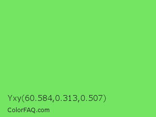 Yxy 60.584,0.313,0.507 Color is a light green color and the nearest color is Pastel Green #77dd77. Hex code #74e563 and RGB value is rgb(116,229,99). In RGB color space, this color is composed of 45% red, 90% green, 39% blue, In CMYK color space, this color is composed of 49% cyan, 0% magenta, 57% yellow , 10% black , In HSL color space, this color has a hue angle of 112° , 71% saturation and 64% lightness.