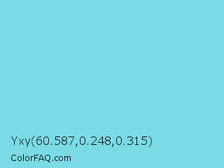 Yxy 60.587,0.248,0.315 Color is a light cyan color and the nearest color is Spray #79deec. Hex code #7adbe6 and RGB value is rgb(122,219,230). In RGB color space, this color is composed of 48% red, 86% green, 90% blue, In CMYK color space, this color is composed of 47% cyan, 5% magenta, 0% yellow , 10% black , In HSL color space, this color has a hue angle of 186° , 68% saturation and 69% lightness.