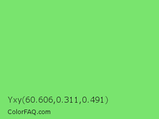 Yxy 60.606,0.311,0.491 Color is a light green color and the nearest color is Pastel Green #77dd77. Hex code #79e46e and RGB value is rgb(121,228,110). In RGB color space, this color is composed of 47% red, 89% green, 43% blue, In CMYK color space, this color is composed of 47% cyan, 0% magenta, 52% yellow , 11% black , In HSL color space, this color has a hue angle of 114° , 69% saturation and 66% lightness.