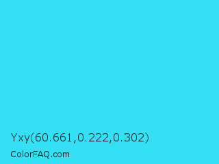 Yxy 60.661,0.222,0.302 Color is a normal cyan color and the nearest color is Loeen #15f2fd. Hex code #35e0f5 and RGB value is rgb(53,224,245). In RGB color space, this color is composed of 21% red, 88% green, 96% blue, In CMYK color space, this color is composed of 78% cyan, 9% magenta, 0% yellow , 4% black , In HSL color space, this color has a hue angle of 187° , 91% saturation and 58% lightness.